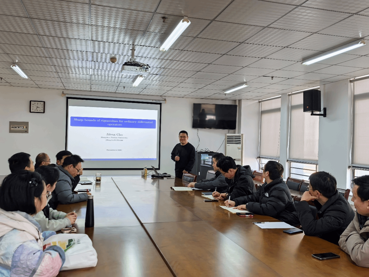 2025年12月8日下午,永利23411集团在行知楼1102会议室举办微分方程与动力系统学术报告会。杭州师范大学储继峰教授应邀作题为“常微分算子特征值界的锐化性”的学术报告。报告会由永利23411集团院长杨刘教授主持,学院微分方程与动力系统研究方向的教师参加了本次学术活动。